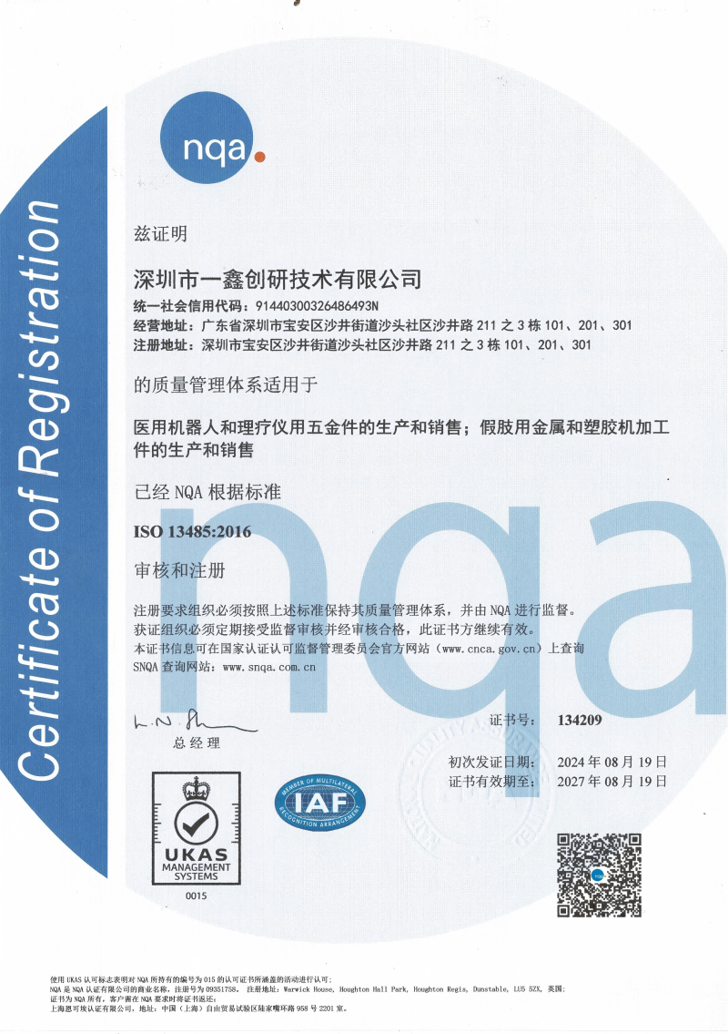 在醫療行業,質量不僅僅是標準,更是法規。一鑫精密通過了ISO 13485:2016醫療器械質量管理體系認證,確保所有加工過程符合以下核心要求: